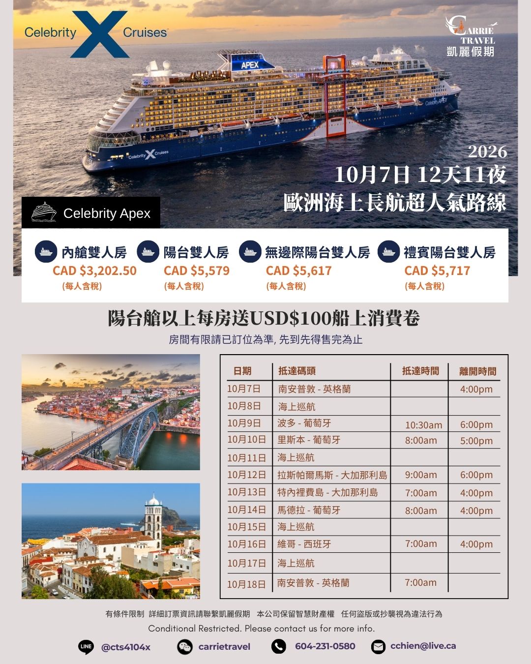 2026年10月7日 名人至極號 12天11夜 超人氣歐洲海上長航線登場