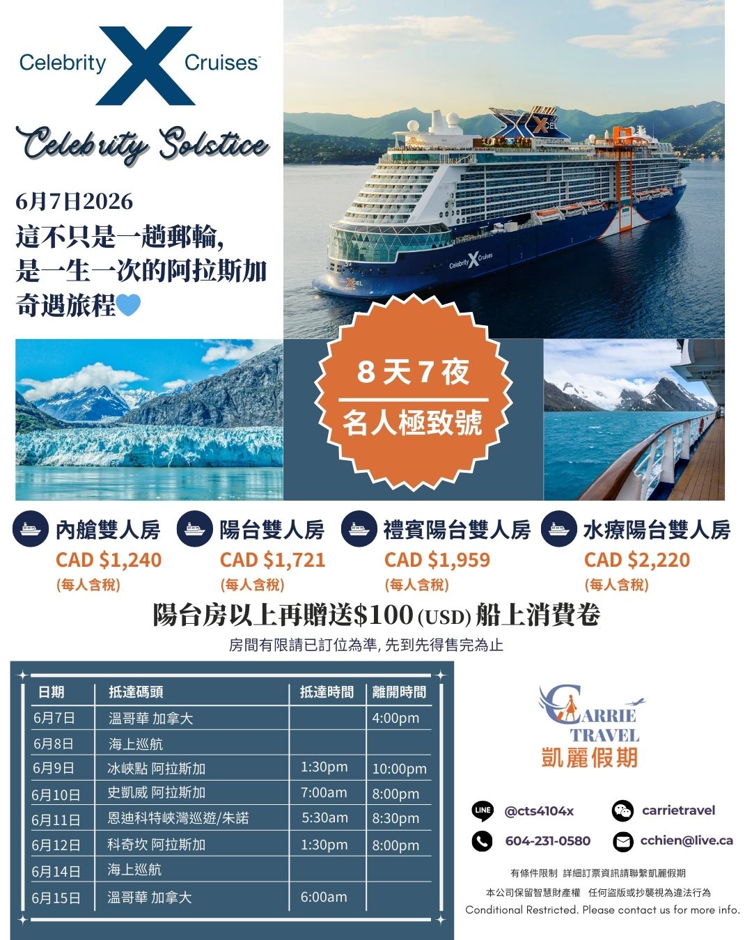 這一次,Celebrity Solstice 名人極致號 帶來 8 天 7 夜阿拉斯加奇遇航程(6/7/2026 出發),