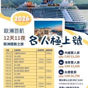 2026 名人郵輪極上號 歐洲深度旅遊 五月十一日出發