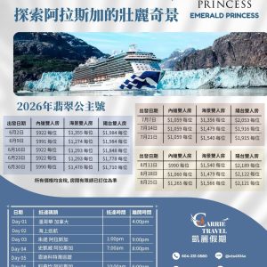 2026 翡翠公主號 8天7夜 航向夢幻冰河灣, 探索阿拉斯加的壯麗奇景
