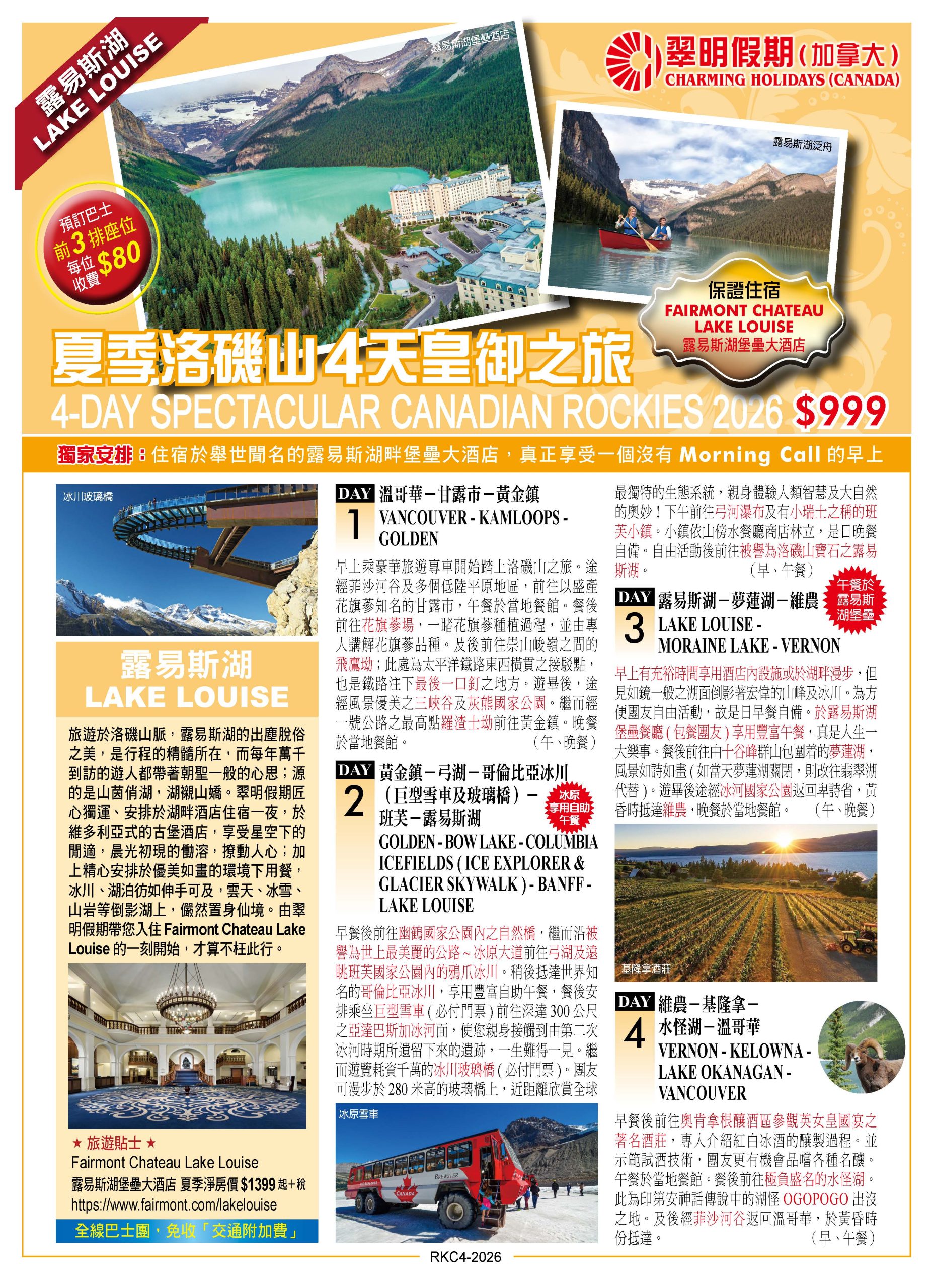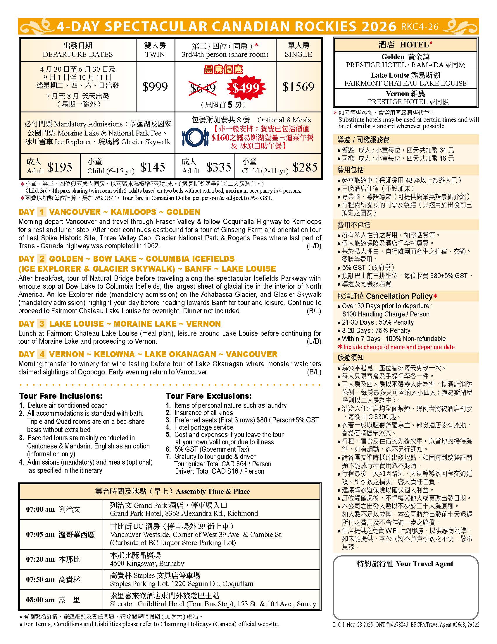 *取消及退款辦法(以每名參團客人為基礎);出發前30天以上取消者,收取每人$50服務費;出發前21-30天內取消者,收取總費用的50%;出發前8天至20天內取消報名者,收取總費用之75%;出發前7日內取消者,收取全額費用。如機票已開,退票辦法按各航空公司規定處理。