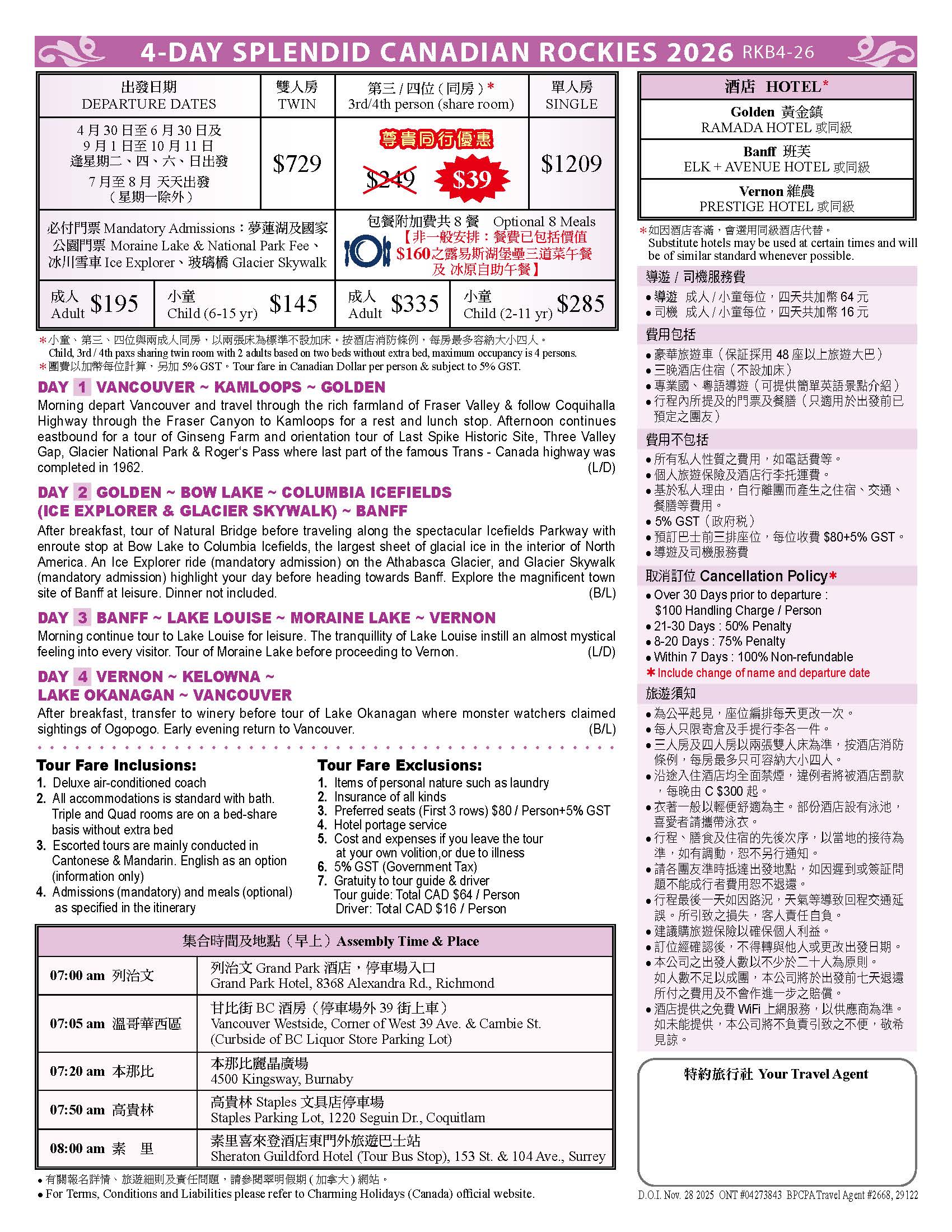 *取消及退款辦法(以每名參團客人為基礎);出發前30天以上取消者,收取每人$50服務費;出發前21-30天內取消者,收取總費用的50%;出發前8天至20天內取消報名者,收取總費用之75%;出發前7日內取消者,收取全額費用。如機票已開,退票辦法按各航空公司規定處理。