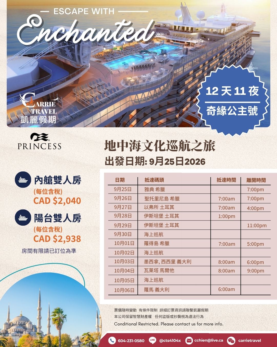 2026 奇緣公主號 夢幻地中海巡航之旅 2026年9月25日出發