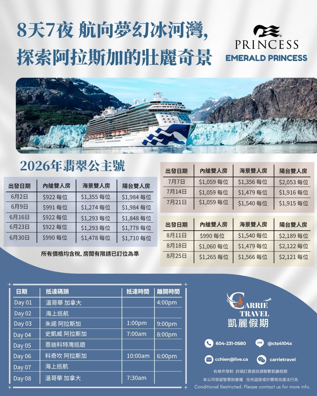 從溫哥華出發,無需轉機,輕鬆啟航! 早鳥優惠價(含稅):